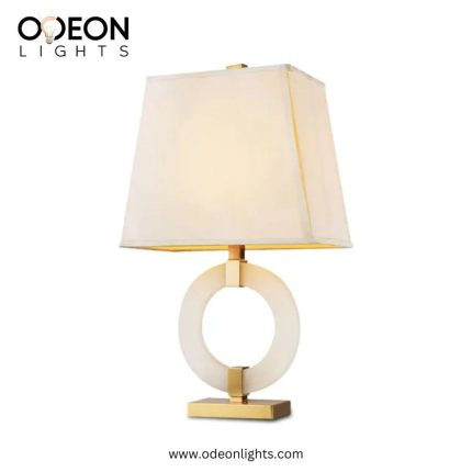 Elevate your space with this sophisticated and modern table lamp, designed to blend minimalism with luxury. The lamp features a striking circular base made from high-quality white stone, accented with elegant brass finishes. Its rectangular fabric shade provides a soft, diffused light, perfect for creating a warm and inviting ambiance in any room. The unique geometric design makes it a stunning centerpiece for your living room, bedroom, or office.