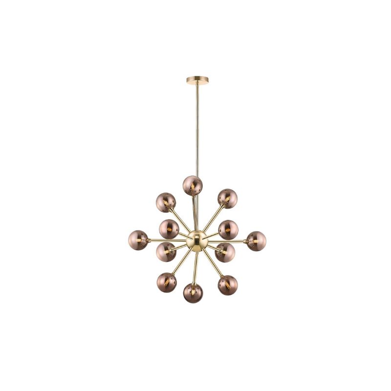 Illuminate your space with elegance and modern flair with this Sputnik-style chandelier. Featuring 12 smoky glass globe shades and a sleek brushed gold metal frame, this mid-century modern ceiling light adds a striking centerpiece to any living room, dining area, or foyer. The symmetrical, starburst design delivers a bold aesthetic that blends effortlessly with contemporary, vintage, or industrial interiors.