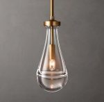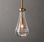 The glass pendant light in the image features an elegant and contemporary design. The light consists of a clear glass shade shaped like an elongated teardrop, which offers a sleek and modern aesthetic. Inside the glass shade, a single exposed bulb is housed, providing a warm and inviting glow. The bulb is connected to a brass or gold-toned metal fixture, which extends upwards and forms the pendant’s suspension rod. This metallic element adds a touch of luxury and sophistication to the overall design. The combination of transparent glass and metallic accents creates a striking contrast, making this pendant light a perfect centerpiece for various interior settings, including dining rooms, kitchens, and living areas.