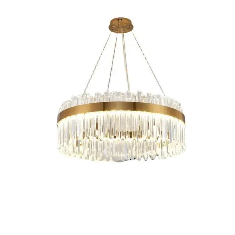 This exquisite chandelier offers a perfect blend of elegance and modern sophistication. The round gold-finished frame is beautifully complemented by cascading crystal prisms that reflect light in every direction, creating a dazzling, radiant effect. Suspended by sleek cables, the fixture provides a luxurious ambiance, making it an ideal centerpiece for grand living rooms, dining areas, or entryways. Its timeless design adds a touch of opulence, while the warm glow from the crystals enhances any interior with a refined, glamorous feel. A true statement piece for those who appreciate bold and stylish decor.