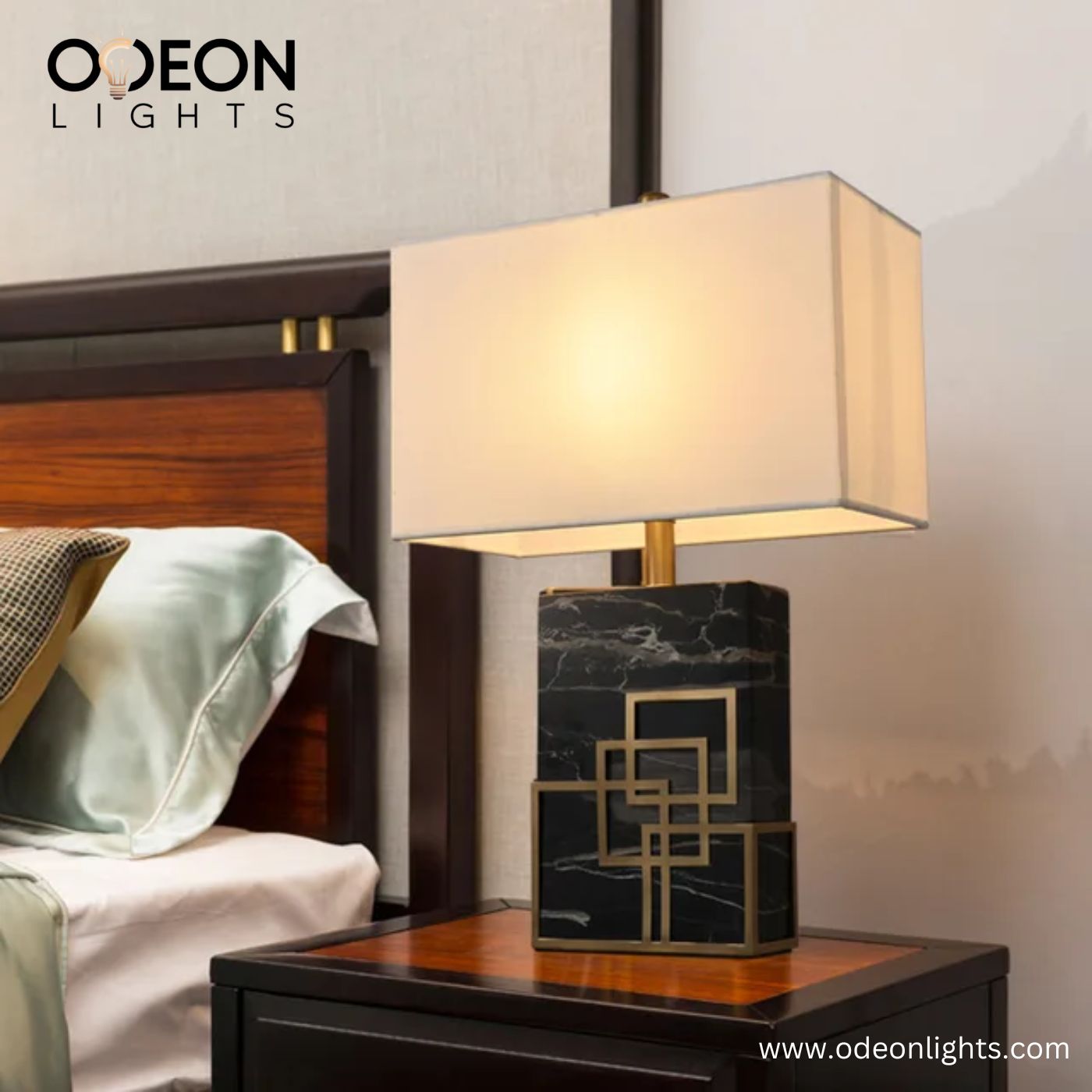 This modern table lamp boasts a striking black marble base with geometric gold accents that create a bold, artistic contrast. The rectangular white shade diffuses a soft, ambient light, making it perfect for creating a cozy yet sophisticated atmosphere in any room. Ideal for contemporary or eclectic interiors, this lamp is a stylish addition to living rooms, bedrooms, or offices, effortlessly blending elegance and functionality.