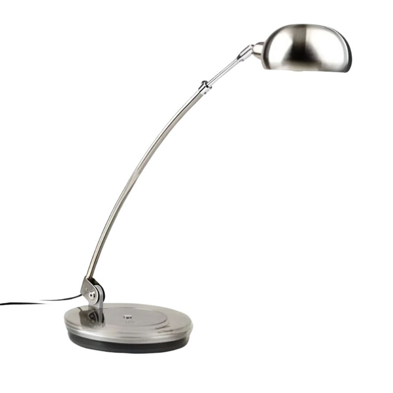 - Shade: White linen fabric shade for a soft, diffused light