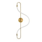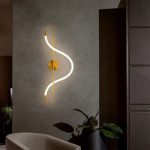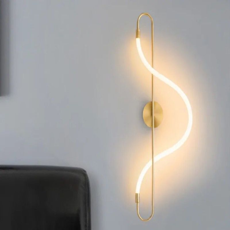 modern wall light fixture with a sleek and minimalistic design. The fixture features a curved LED light strip attached to a thin, vertical gold or brass metal frame. The light creates a soft, warm glow, adding a touch of elegance and contemporary style to the surrounding space. It seems ideal for use in bedrooms, living rooms, or as accent lighting in a chic café or lounge.