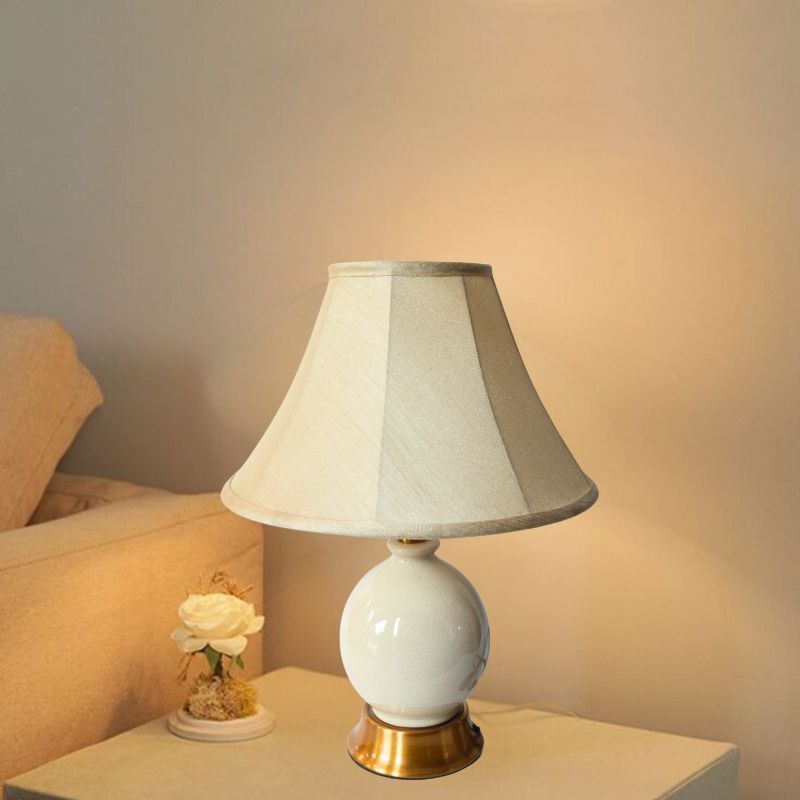 Elevate your interior decor with this modern ceramic table lamp. The spherical white ceramic base is paired with a sophisticated beige fabric shade, creating a warm and inviting glow. The gold-colored base adds a chic touch, making it an excellent choice for any room in your home.