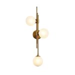 This is a modern, minimalist wall sconce featuring a brushed gold metal base and three opal glass globes arranged in a vertical alignment. The elegant design provides a contemporary touch, suitable for various interiors, including living rooms, bedrooms, and hallways.