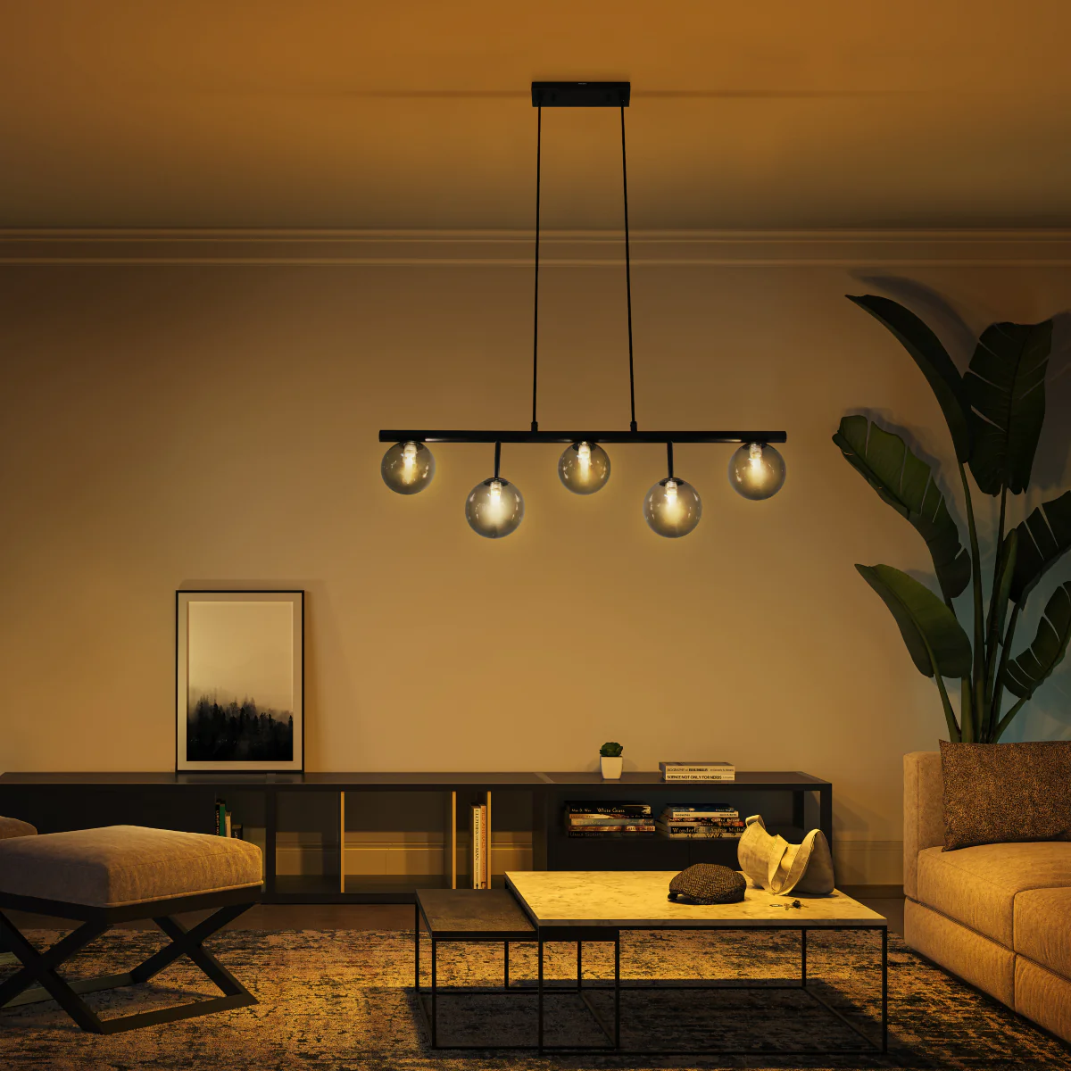 - With its five smoky black heads, this chandelier emanates a cozy warmth when illuminated, while its matte black body and smoky black glass exude elegance and refinement even in the absence of light.